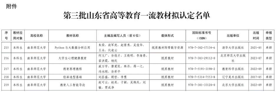 日前,山东省教材委员会办公室公布第三批山东省普通高等教育一流教材名单,曲阜师大5种教材入选,分别是教育学院戚万学教授主编《德育原理教程》、心理学院何文广教授主编《大学生心理健康教育》、美术学院刘昌盛教授主编《绘画造型基础》、传媒学院赵可云教授主编《教育人工智能导论》和计算机学院朱荣副教授主编《Python与大数据分析应用》。